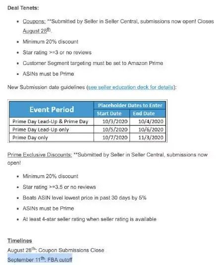邮件中告知卖家,需要参加Prime Day秒杀活动的FBA货物必须在2020年9月25日前送达亚马逊仓库。连入仓截止日期都要9月底了,那Primeday很大几率是要等到10月才能正式开始了。