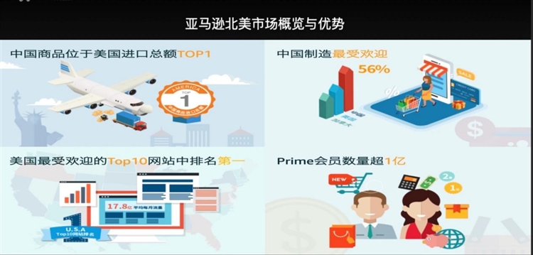 只要我们开通美国站,就可以同时开通剩下2个站点。美国站是亚马逊全球最大的市场。当然,美国站也是中国出口商品种类排至第一名的。这几年美国的电子商务发展的也非常快,达到美国总零售额的17%,而且每年也保持百分之十几的增长。亚马逊占据美国电商销售总额的28%,排名第一;整体的流量也是排名第一的,每个月流量达到17亿多,占所有电商平台的流量份额一半以上。